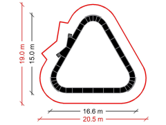 PC2A Kolmio Pumptrack sisältää kolme 60 asteen mutkaa ja kolme suoraa kumpuineen, mikä mahdollistaa kovan vauhdin ylläpitämisen koko radan läpi. Ajoradan pituus on 52 metriä. Näppärät käyntirampit mahdollistavat radalle helpon pääsyn ja siltä poistumisen. Pumptrack PC3 soveltuu soveltuu aloittelijoille, mutta myös jo enemmän lajiin tutustuneille. Rata voidaan asentaa tasaiselle asfaltille, betonille tai hyvintehdylle sora-alustalle. Ympäröivästä maastosta voidaan myös muokata radan muotoja mukaileva upea harrasteympäristö. Muoto mahdollistaa mm. penkkien ja liikuntavälineiden sijoittamisen radan kehän sisälle.