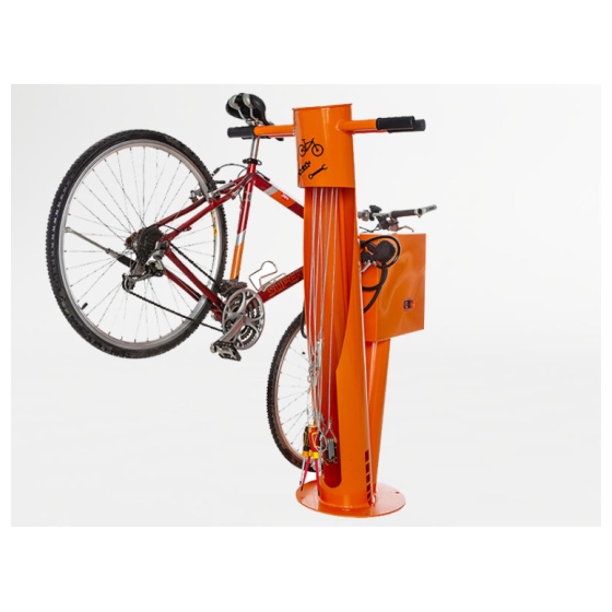 Kätevä pyörähuoltopiste paineilmakompressorilla varustetulla pumpulla sisältää tärkeimmät työkalut nopealle perushuollolle. Telineen työkaluilla voit säätää satulaasi, pumpata ja vaihtaa renkaat, säätää vaihteita, kiristää ruuveja, jne...